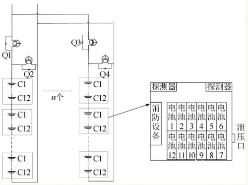 每个Pack内配置压力传感器、烟气传感器、消防装置。当有部分电芯发生形变而引起Pack内压力变化,可由压力传感器测得;当有部分电芯产生气体或烟雾时,由烟气传感器测得;当Pack电池监控单元综合各种传感数据,判断处于紧急状况时,可自行启动内部的消防装置。