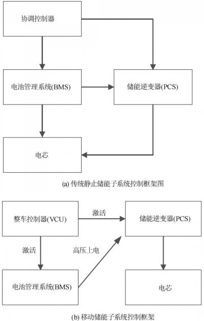 文献的静止储能协调控制框架为: BMS和PCS将全部数据传输给协调控制器,PCS将部分关键数据传送给BMS,协调控制器经过处理后传输给上位机;当上位机给协调控制器下发调度指令,协调控制器经过处理后,直接给PCS下发协调指令,同时PCS在接收到BMS许可的情况下,才可以改变控制模式,如图2(a)所示。文献的移动储能协调控制框架为:当充电枪与车辆对接后,充电信号就会激活整车控制器(VCU),VCU同时激活BMS和充电桩,BMS作为电池的直接管理者,BMS控制充电桩给动力电池充电,如图2(b)所示。