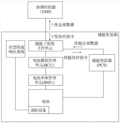 储能子系统主控单元负责与EMS通信, EMS将数据上传至主站,并在本地的监控端显示。EMS接受主站下发的指令后,经过处理直接给储能子系统主控单元下发协调控制指令,储能子系统主控单元负责与PCS进行通信,控制电池进行充放电,同时PCS不再提供对EMS的数据接口,减少了新型储能子系统对外通信线束,储能子系统主控单元与应急快速响应系统通信,实时地将储能电站的安全信息上传至储能子系统主控单元。