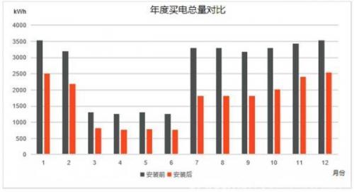 对比安装光储前后的买电量,可看出整体买电量削减,夏季甚至最高削减50%左右。