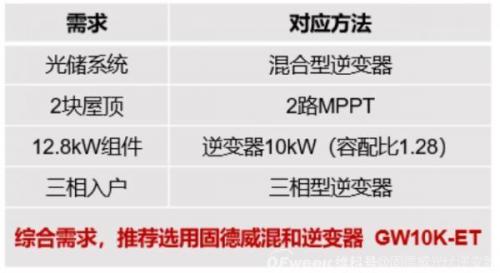 综合组件参数、房屋的硬性条件,以及用户对整个系统的需求。推荐使用混合逆变器GW10K-ET。