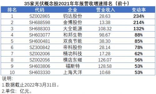 在光伏行业火热的市场氛围中,2022年已经悄然走过了四分之一。在过去的三个月中,A股市场共有35家光伏概念股发布了2021年年报,营收增速均值和中值分别为44%和37%,扣非净利润增速均值高达147%,不过中值仅为27%。