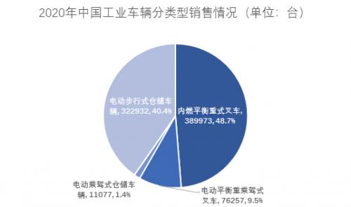 其中2020年共销售内燃平衡重乘驾式叉车389,973台,全年销量占比48.7,与上年同期的309,704台相比,上升了25.92%。内燃平衡重乘驾式叉车中,柴油叉车为374,642台,其余为汽油叉车(含双燃料)15,331台。