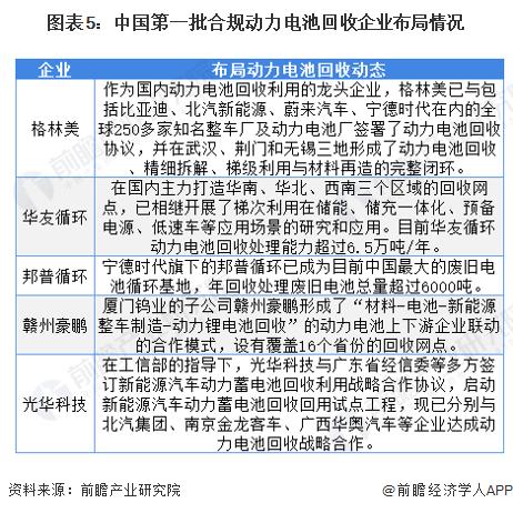 仅工信部发布的符合《新能源汽车废旧动力蓄电池综合利用行业规范条件》企业名单第一批5家合规企业的电池处理能力就达到60万吨以上。其中格林美公司设计总拆解处理能力达45万套/年,回收处理的废旧电池(除铅酸电池外)占中国报废总量的10%以上。其余企业也在与上下游的产业联动上进行布局,通过与电池厂商、动力电源原材料企业进行合作。