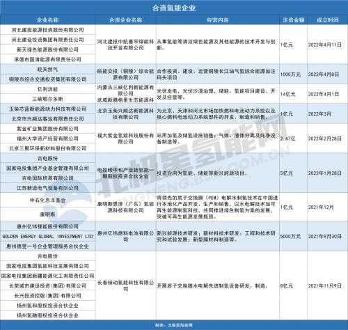 据北极星不完全统计,近日来,通过合资成立的氢能企业已有10家,涉及28家公司。其中在制氢领域,包括由吉电股份与国家电投合资成立的长春绿动氢能科技有限公司,该公司主要从事开展质子交换膜水电解先进制氢设备研发、制造。