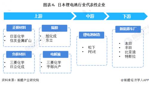 日本锂电池行业发展较早,行业发展较为成熟,目前行业内各产业链均有龙头企业。正极材料的龙头企业有日亚化学、住友金属矿山;负极材料的龙头企业有三菱化学、日立化成;隔膜的代表性企业有旭化成、东立;电解液的代表性企业有三菱化学、宇部兴产。锂电池制造的龙头企业有松下以及PEVE。下游新能源车厂的企业较多,包括本田、丰田等。