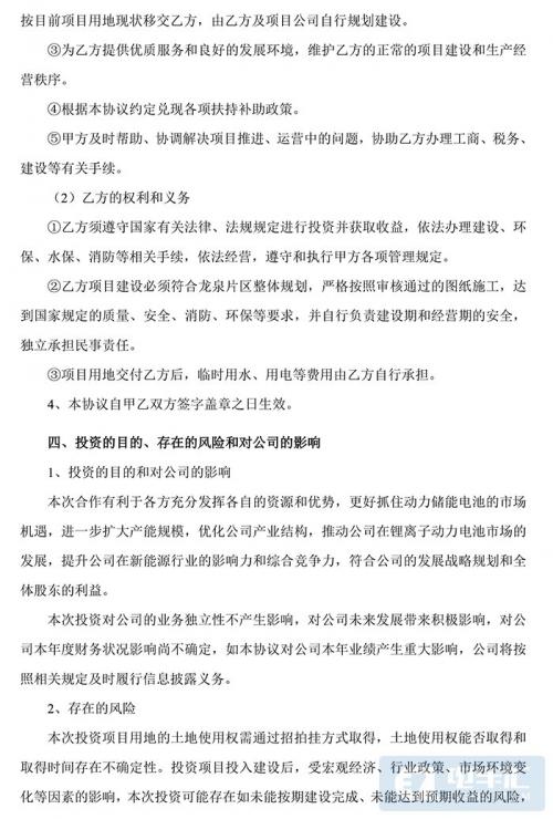 关于投资的目的和影响,公告显示,本次合作有利于各方充分发挥各自的资源和优势,更好抓住动力储能电池的市场机遇,进一步扩大产能规模,优化公司产业结构,推动公司在锂离子动力电池市场的发展,提升公司在新能源行业的影响力和综合竞争力,符合公司的发展战略规划和全体股东的利益。同时,本次投资对公司的业务独立性不产生影响,对公司未来发展带来积极影响,对公司本年度财务状况影响尚不确定,如本协议对公司本年业绩产生重大影响,公司将按照相关规定及时履行信息披露义务。