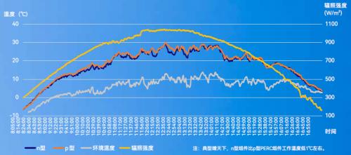高温环境下,结合优异的温度系数和较低的工作温度,n型组件发电量比p型PERC高2%左右。晶澳联合TÜ V北德在CPVT银川国家光伏户外实证基地一年期的实证结果显示,典型晴天下,n型组件比p型PERC组件工作温度低1℃左右。