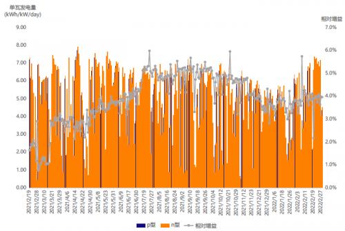 晶澳与TÜV北德在银川实证基地年度实证数据显示(2021年2月~2022年2月),与传统p型技术相比,n型产品单瓦平均发电量高约3.9%。