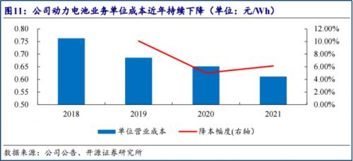 除此之外,宁德时代动力电池业务的成本控制水平持续优化,其单位营业成本稳步下滑,即便在上游成本压力高企的2021年,公司单位营业成本仍实现降低。