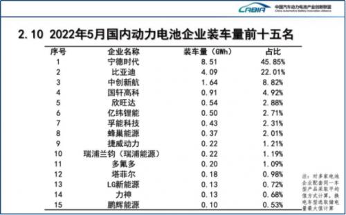 具体来看,宁德时代市占率再次大幅上涨,5月装车量8.51GWh,环比大涨67.5%,市占率升7.5个百分点至45.75%,稳居行业第一,几乎占据了半壁江山。与之相反的是,比亚迪装机量4.09GWh,环比下降4.2%,市占率大幅下降,5月下降10.2个百分点至21.99%,位居第二。