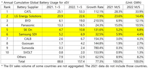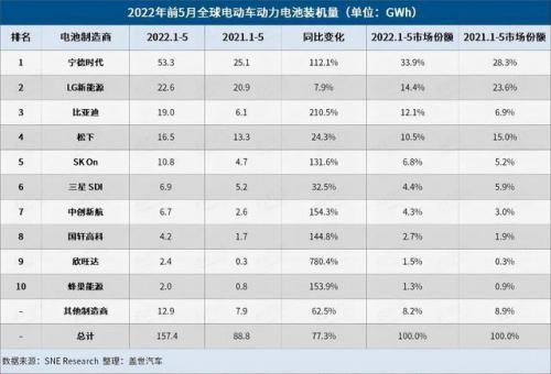 7月4日,韩国一家市场研究机构SNE Research公布了2022年1-5月全球电动汽车电池的装车量报告。