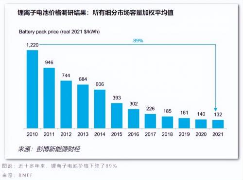 因原材料价格上涨导致动力电池价格的上涨,应该是短暂的。从近十年的历史看,动力电池的价格是一直在下降。自2010年以来,锂离子电动汽车电池组的平均价格已从每千瓦时(kWh) 1,200美元降至2021年的132美元/千瓦时。自2012年以来,电动汽车电池的平均总成本下降了近90%。