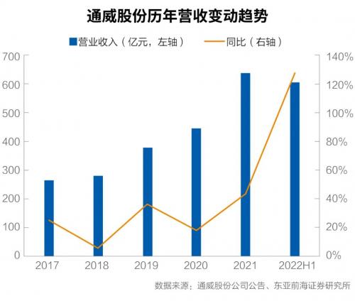 截至2022年三季度末,通威股份为全球第一大多晶硅厂商,全球市场份额近30%。另据PV Infolink数据,2022年上半年,电池片出货排名前五分别为通威股份、爱旭股份、润阳股份、中润光能、捷泰科技。通威股份为第一大电池片厂商。