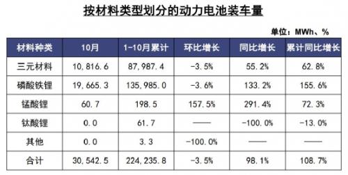 虽然在10月份多家电池厂商装车量出现下跌,但截止今年1-10月,我国动力电池累计装车量累计达224.2GWh,同比增大涨108.7%。其中三元锂电池装车量88.0GWh,占比39.2%,磷酸铁锂电池装车量136.0GWh,占比60.6%。