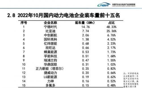 从排名来看,10月份宁德时代以装车量14.8 GWh保持国内第一,市占率高达48.3%,虽然稳住了冠军之位,但继4月份和7月份后,宁德时代装车量再次环比下降了2.4%。