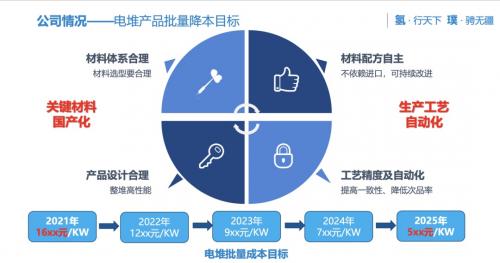 当下氢璞的技术路线,重点围绕着上述的三个大的方向在做演进。而电堆在整个氢燃料电池中,成本占比在50%-60%,将电堆的生产成本持续降低,本质上也就是降低了核心的使用成本。