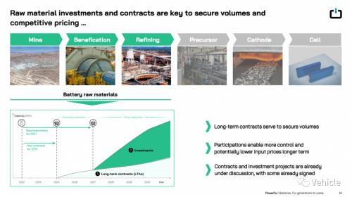 所以对于主机厂来讲,掌握电池供应链是多么的重要。所以大众的电池新公司PoweCo在原材料供应链(矿,选矿,提纯)方面已经开始与矿主们签合同或者投资的方式进行准备,计划支持2025年到2027年的产量,从2027年之后进行降本。通过这里可以回想中国的比亚迪,比亚迪应该是在2010年之前就开始投资锂矿了,这样看,早了很多公司10几年,所以研究比亚迪现在为什么卖的好的机构们,还是想想如何预测未来,早布局,坚持干产品。