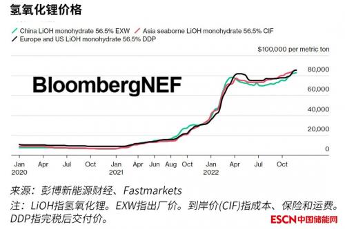11月底亚洲海运以及欧洲和美国的氢氧化锂价格,为纪录高位