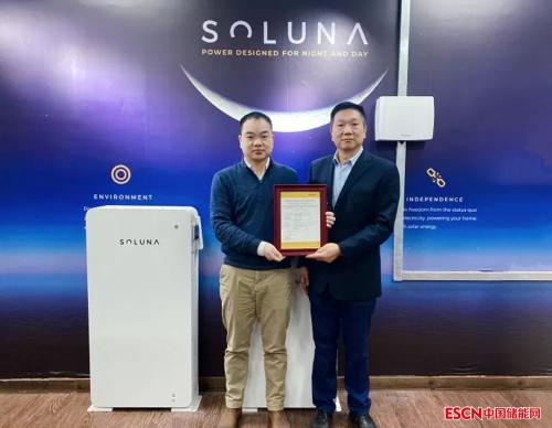 Intertek电子电气华东北区总经理金志斌先生(右)为Soluna总经理郭康先生(左)颁发UL 9540A证书