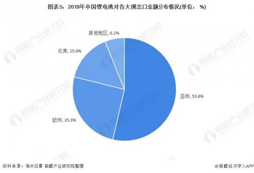 除了来自我国的动力电池需求外,欧洲也是我国动力电池重要的增长来源。由于欧洲本地动力电池产能较低,因此车企多依靠进口中日韩企业的电池。2019年,欧洲占我国锂电池出口总额比重达到了25.3%,欧洲对2019年我国锂电池出口金额增长的贡献率达到了58.6%,成为主要增长动力来源。