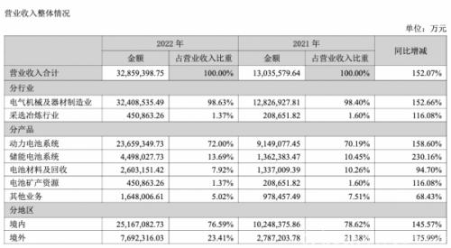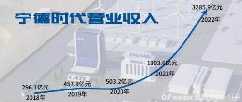宁德时代营业收入在2022年实现大幅跨越,从2021年的1303.56亿元增长152.7%,达到3285.9亿元,跨越3000亿大关。这也得益于新能源汽车销量爆发式增长。