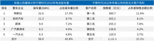 根据上险量统计,2022年宁德时代电池装车量前五名的新能源乘用车企业是特斯拉、吉利汽车、蔚来、广汽乘用车、一汽大众,五家企业合计电池装车量为56GWh,占比42.8%。
