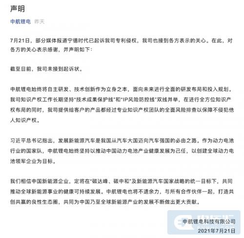 电车汇消息:昨日,据财联社报道,宁德时代已经正式起诉中航锂电专利侵权。该人士透露,中航锂电涉嫌侵权范围覆盖其全系产品。法律界人士表示,中航锂电一旦败诉,全系产品可能面临禁售。