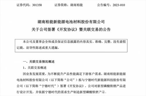 3月15日晚间,湖南裕能发布公告,拟与宁德时代签署《开发协议》,对新型磷酸铁锂产品进行设计开发,并依据宁德时代的需求生产制造新型磷酸铁锂产品。