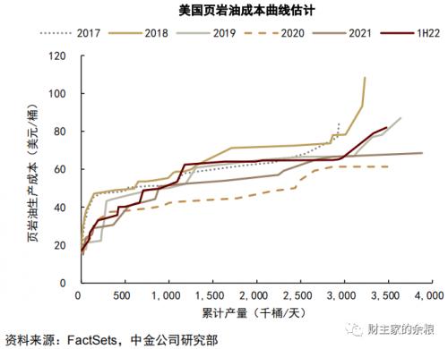 根据有关研究机构对美国页岩油产区的调查,2022年美国能源企业,2/3的页岩油,其生产的边际成本都集中在65美元/桶(见下图),这也意味着,如果WTI油价低于65美元/桶并持续下去,那么,美国市场上大部分页岩油企业将无法持续维持生产。