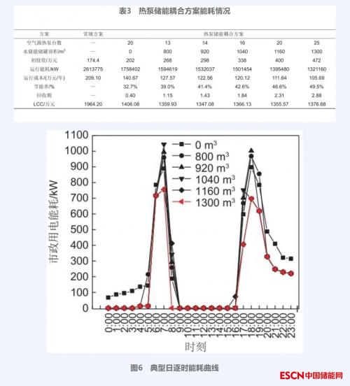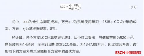 除了以上数学模型外,本方案优化算法是通过逐时气温条件、逐时光伏发电情况、逐时负荷情况,结合液流电池的充放电状态、液流电池储热出力情况,设定逐时水储能储罐供能情况,从而确定热泵装机容量和储罐有效容积,进而计算出不同热泵装机、不同储罐有效容积的多种方案,最后根据运行成本、初投资等经济性指标确定最终方案。