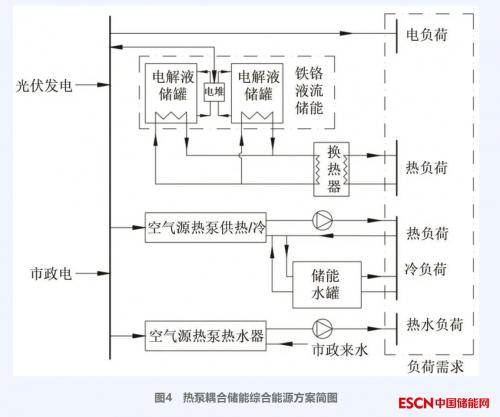 热泵储能耦合方案为光伏+空气源热泵冷热双供+液流电池储电储热+水储能方案。热泵是一种节能装置,通过利用少量电能将低品位能源利用起来,满足建筑物供暖制冷需求。本方案配置一定规模空气源热泵,利用空气能实现建筑物的冷热双供。配置空气源热泵热水器满足热水需求。在原有铁-铬液流电池系统基础上进行优化设计,增设液流电池储热换热单元,满足部分热负荷需求。与锂电池不同,液流电池功率单元与能量单元相互独立,功率单元为电池堆,能量单元为电解液储罐。与全钒液流电池相比,铁-铬液流电池为提高其反应活性,运行温度较高、温度适应范围更广。电解液储罐除了储存电能外,还可以利用电解液的温差变化进行储热,实现液流电池储电储热。此外,为进一步消纳光伏,降低市政用电,本方案配置一定容量的水储能储罐,在白天光照充足时段利用弃光驱动热泵机组制热制冷,将冷热能量进行储罐储存,夜晚使用市政用电阶段将冷热能量进行循环释放,实现弃光时空转移,提高系统经济效益。本综合能源方案的工艺架构简图如图4所示。综上,电负荷通过液流电池放电、光伏发电、市政电提供;热负荷通过液流电池储热换热、储罐储热、空气源热泵供热提供;冷负荷由空气源热泵制冷、储罐储冷提供。结合光伏发电曲线、不同规模的水储能储罐配置容量,进行数据建模、多方案设计及运行分析,通过技术经济指标进行约束,最终得到最优方案。