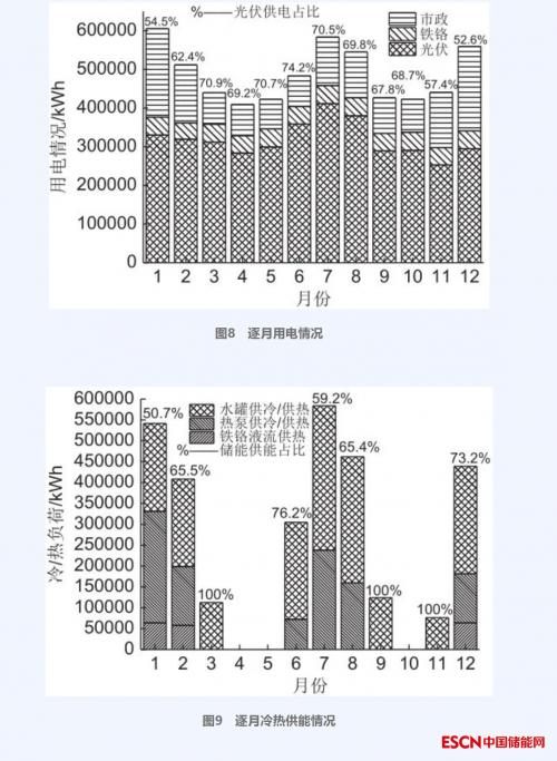(3)通过配置铁-铬液流电池储电储热、水储罐储热储冷,使得全年平均光伏用电为全部用电的65.3%。在冷热负荷供应层面,实现了储能供应占全部供冷热的67%以上,实现了3月、9月、11月储能供能占比100%。