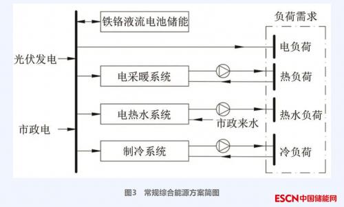 常规综合能源方案为光伏+电采暖+冷水机组+液流储电方案,在已有光伏、铁-铬液流电池储电的基础上,考虑建筑物具有冷热电负荷、生活热水负荷需求,本方案配置常规电极锅炉采暖、冷水机组制冷、电热水系统。液流电池系统通过每天一次充放电,能够实现部分弃光的时空转移,有效降低市政电负荷。主要的综合能源方案系统架构如图3所示。