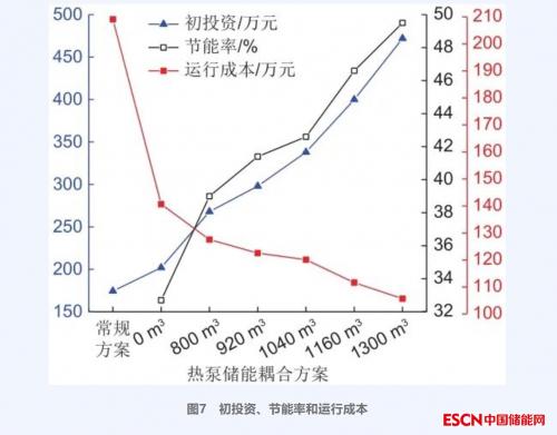 结合前述各方案设备选型,常规综合能源方案设备如前所述,热泵储能耦合方案有6种不同规模的储罐参数、具有6种不同数量的热泵机组台数,这些均造成了各类方案的初投资差异。在不考虑公共相同部分的光伏电站初投资、铁-铬液流电池储能系统初投资情况下,各类的初投资情况见表3。运行成本是在运行能耗的基础上乘以市政用电电价(按照0.8元/kWh)而得。节能率是以常规方案为基准,根据各方案的节约能耗占常规方案运行能耗的比例进行计算确定。图7为初投资、节能率以及运行成本的对比情况。采用热泵方案后,全年各类用电综合运行成本有了较大幅降低,降低了32.7%。随着储罐容积的增大,初投资逐步增大,运行成本依次降低,节能率逐步提高,具有较好的经济性和节能效果。