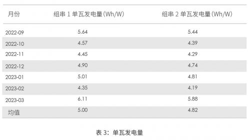 2022年9月-2023年3月测量的月度发电增益,并根据公式1计算得出两个组串的单瓦发电量(Wh/W),其结果如表3和图3所示: