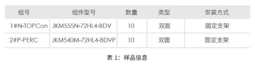 户外对比研究中,采用晶科能源20块双面组件,包含P-PERC以及N-TOPCon技术。每个双面组件包含144块半片电池,具体如下: