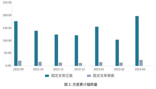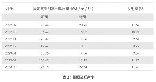 2022年9月-2023年3月测得的组件正面、背面累计辐照量、反射率数据,结果如表2和图2所示: