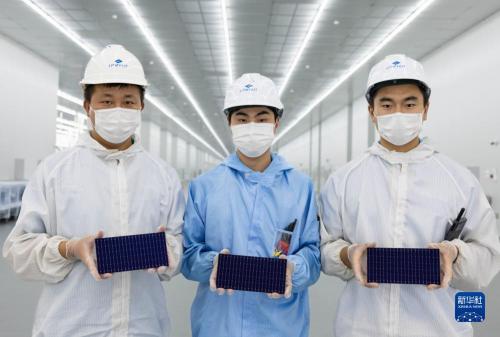 8月22日,在四川省丹棱县经济开发区的眉山琏升光伏8GW高效异质结电池项目电池车间,员工手捧第一批下线的异质结电池成品。新华社记者江宏景摄