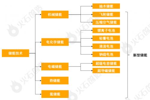 储能指通过某种介质将能量存储起来,在需要时释放出来的过程。根据能量存储形式的不同,广义储能包括机械储能、电化学储能、电磁储能、热储能、氢储能等,其中机械储能主要包括抽水蓄能、压缩空气储能、飞轮储能和超级电容储能等,电化学储能是指各种二次电池储能,主要包括锂离子电池、铅蓄电池、液流电池、钠硫电池等。按国家能源局的定义,新型储能是除抽水储能外的新型储能技术。
