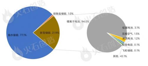 截至2022年底,中国已投运电力储能项目累计装机规模59.8GW,占全球市场总规模的25%;年增长率38%,显著高于全球15%的增长速度,整体产业处于快速增长阶段。从结构来看,抽水储能仍为主要装机类型,但其占比从2020年的89.3%降低至2022年的77.1%。取而代之的是新型储能高速发展,2023年新型储能累计装机规模首次突破10GW,达到13.1GW,年增长率达128%。新型储能中锂离子电池占比达94%,是正处于爆发阶段的细分赛道;此外,压缩空气储能、液流电池、钠离子电池、飞轮等其它技术路线的项目,在规模上有所突破,应用模式逐渐增多。