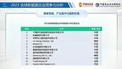 总体来看,光伏、储能引领新能源行业发展,全球前10强中,光储各占4名,中国企业则包揽了7个名次,分别是宁德时代、协鑫、中国电建、比亚迪、隆基绿能、晶科能源、通威股份。