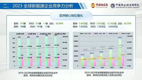 新能源企业前500强中,亚洲国家占比已经超过60%,并且连续维持了三年。收入比重也越来越大,超过60%。