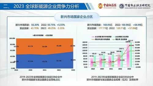 从全球格局来看,无论是企业数量、营收、规模,新兴国家的新能源产业均占据优势,只不过平均规模稍弱,但差距已十分微小。2022年,新兴市场国家新能源企业规模增长68%,超过了全球平均水平。