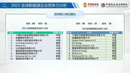 亚洲国家核心地位不断强化,今年全球新能源企业前十强中,形成了以中日韩为主的态势,中国企业占据了7家之多。前20强中,中国占了一半。
