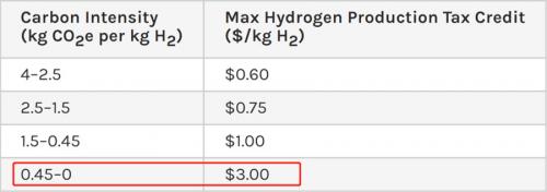 根据氢气生产路径碳强度的不同,税收抵免激励程度也不同,比如如果生产1千克的氢气只排放0-0.45千克的二氧化碳当量,就可以获得3美元/公斤的最高补贴。并且,绿氢项目还可申请最高30%的投资税收抵免。