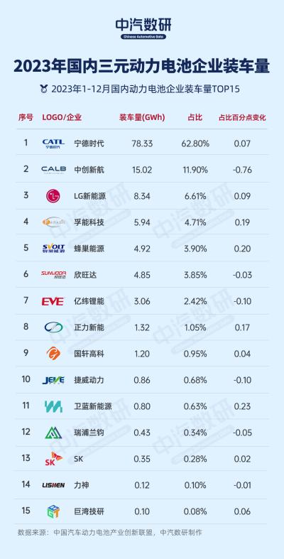 2023年12月,中国动力电池企业装车量TOP15分别是宁德时代、比亚迪、中创新航、亿纬锂能、国轩高科、蜂巢能源、LG新能源、瑞浦兰钧、欣旺达、孚能科技、正力新能、多氟多、卫蓝新能源、极电新能源、荣盛盟固利。