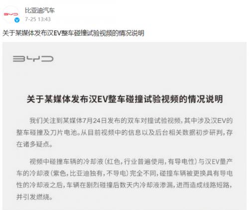比亚迪官方微博第一时间发声质疑,认为被测试的汉EV更换了具有导电性的红色冷却液,由于冷却液渗漏造成线路短路,引起了燃烧。而汉EV量产车的冷却液,是比亚迪独有的紫色,不具有导电性。同时,比亚迪也提出懂车帝的测试标准和方法为非主流、非权威,并非国家及行业标准。