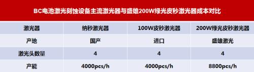 值得关注的是,尽管BC电池技术优势明显,但热制程镀膜和激光开膜图形化、后续清洗设备上的壁垒和高昂的设备投资成本仍是目前各大企业抉择投入大规模量产的难题,而激光图形化加工无疑是当前BC技术破局最关键的工艺,国内相应的激光设备厂商技术研发破局的积极性也因此水涨船高。其中,笔者关注到盛雄激光最新推出的200W绿光皮秒激光器,或将成为颠覆BC电池制造工艺的关键技术——大功率超快皮秒激光器对BC电池的开膜刻蚀更彻底,对后续清洗工艺要求更低、时间更短,对热制程镀膜工艺窗口参数更加包容。