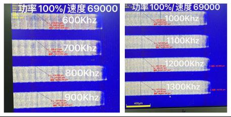 因为在刻蚀200-300 μm线宽方形大光斑图形时,如果单脉冲能量低于300 μJ时,单位平方微米的能量密度不够,就去除不了膜层,常规激光器做大单脉冲能量都是靠降低激光器的重复频率来实现。